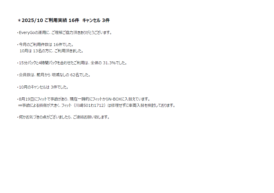 2025年11月9日 / 最終更新日時 : 2026年1月11日 管理防災センター 01 管理組合からのお知らせ 住民用:カーシェアリング利用状況(10月度) コメントを残すメールアドレスが公開されることはありません。 ※ が付いている欄は必須項目ですコメント ※ 名前 ※ メール ※ サイト