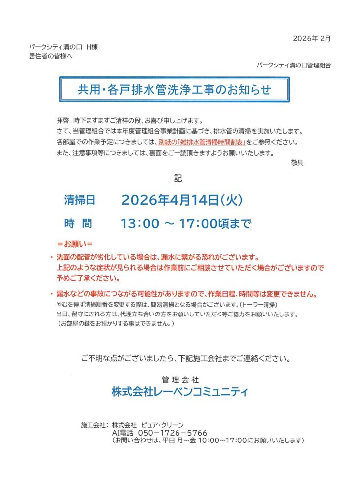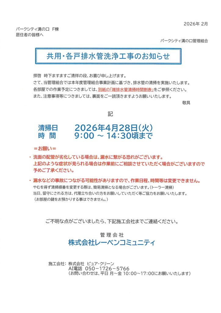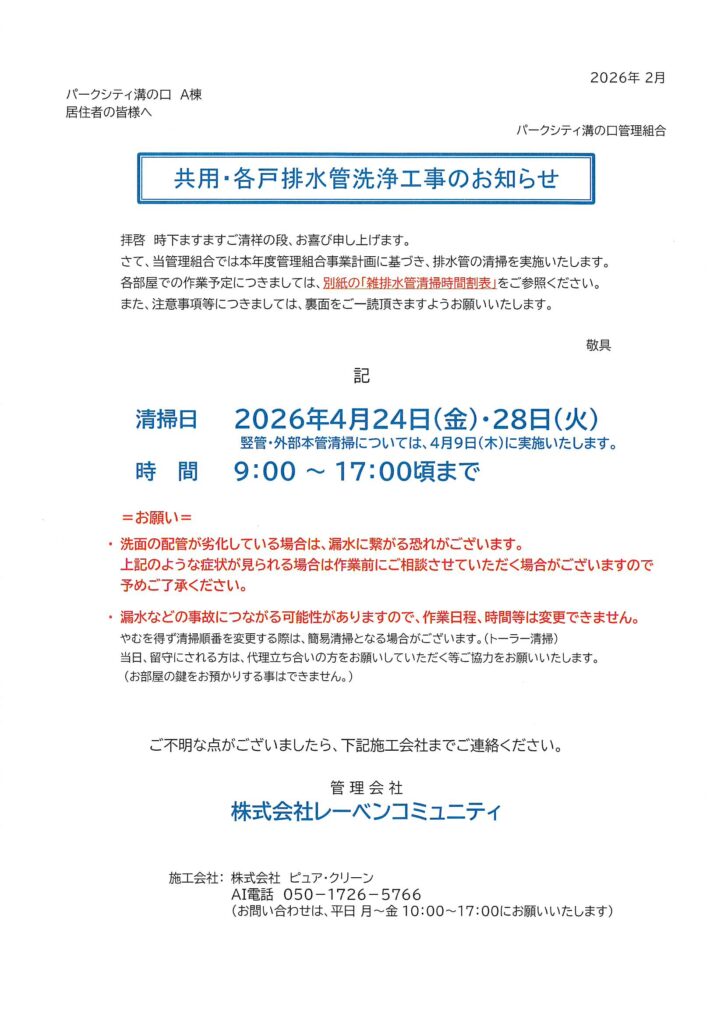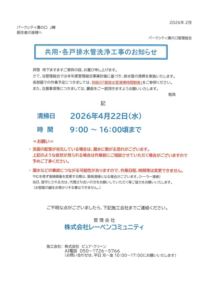 2026年2月28日 / 最終更新日時 : 2026年2月28日 管理防災センター 01 管理組合からのお知らせ 住民用:共用・各戸排水管洗浄工事のお知らせ コメントを残すメールアドレスが公開されることはありません。 ※ が付いている欄は必須項目ですコメント ※ 名前 ※ メール ※ サイト