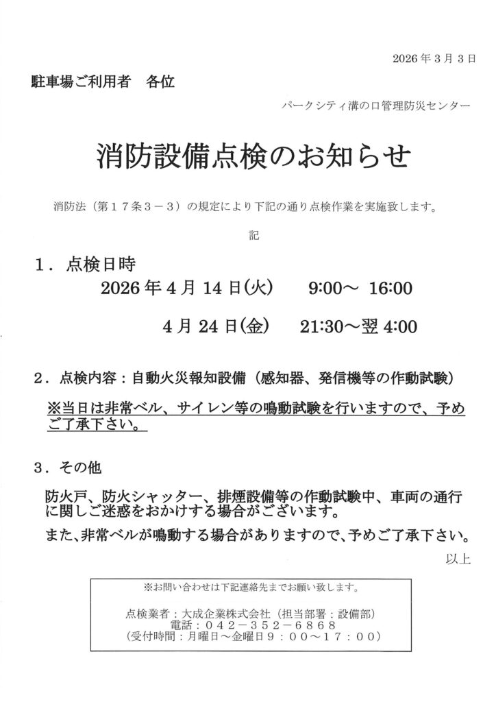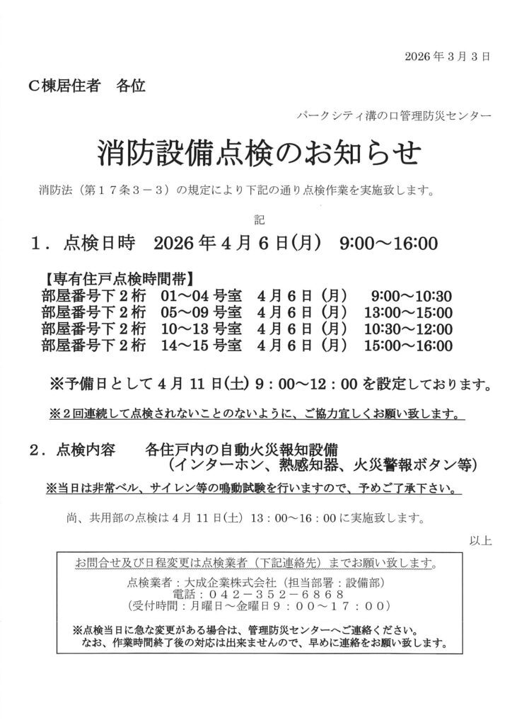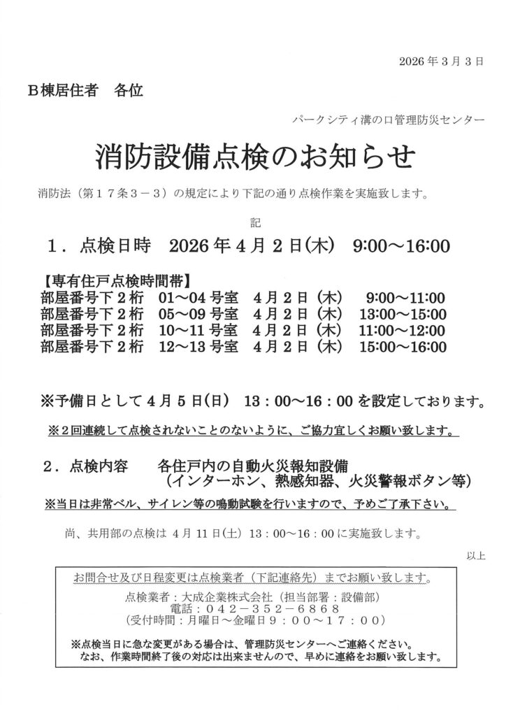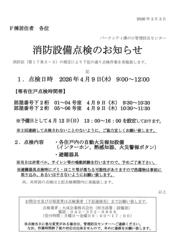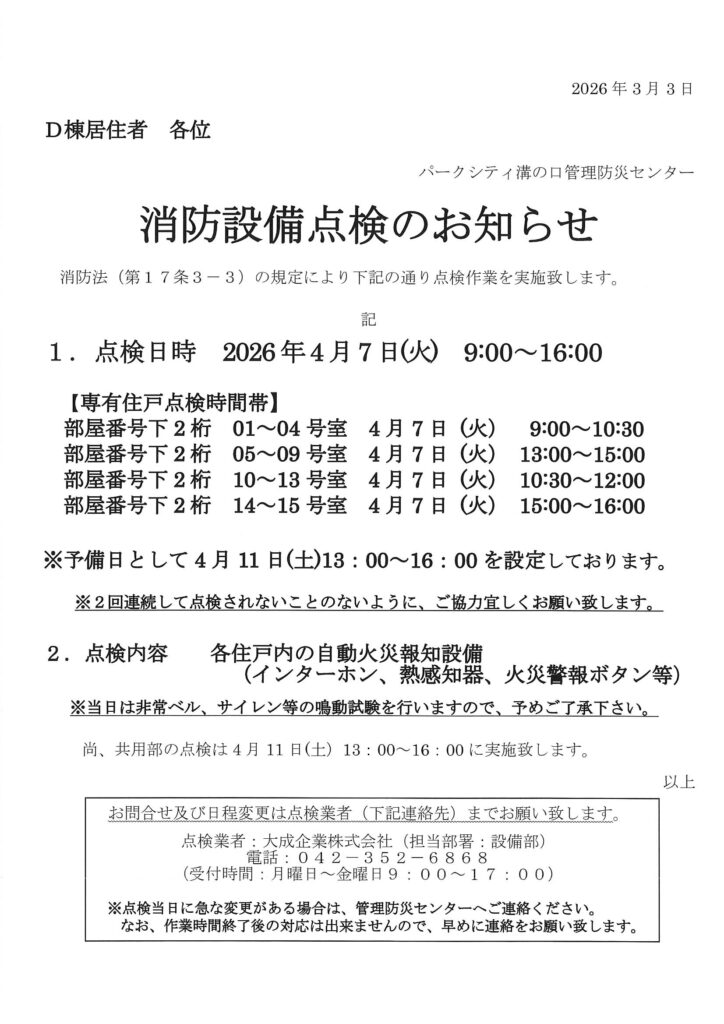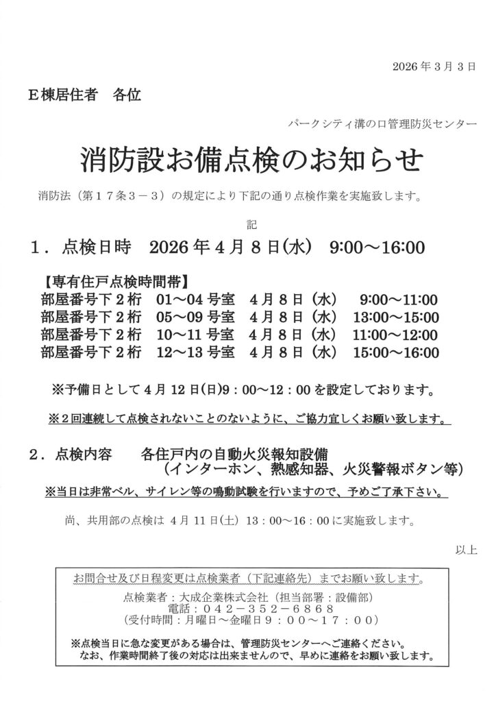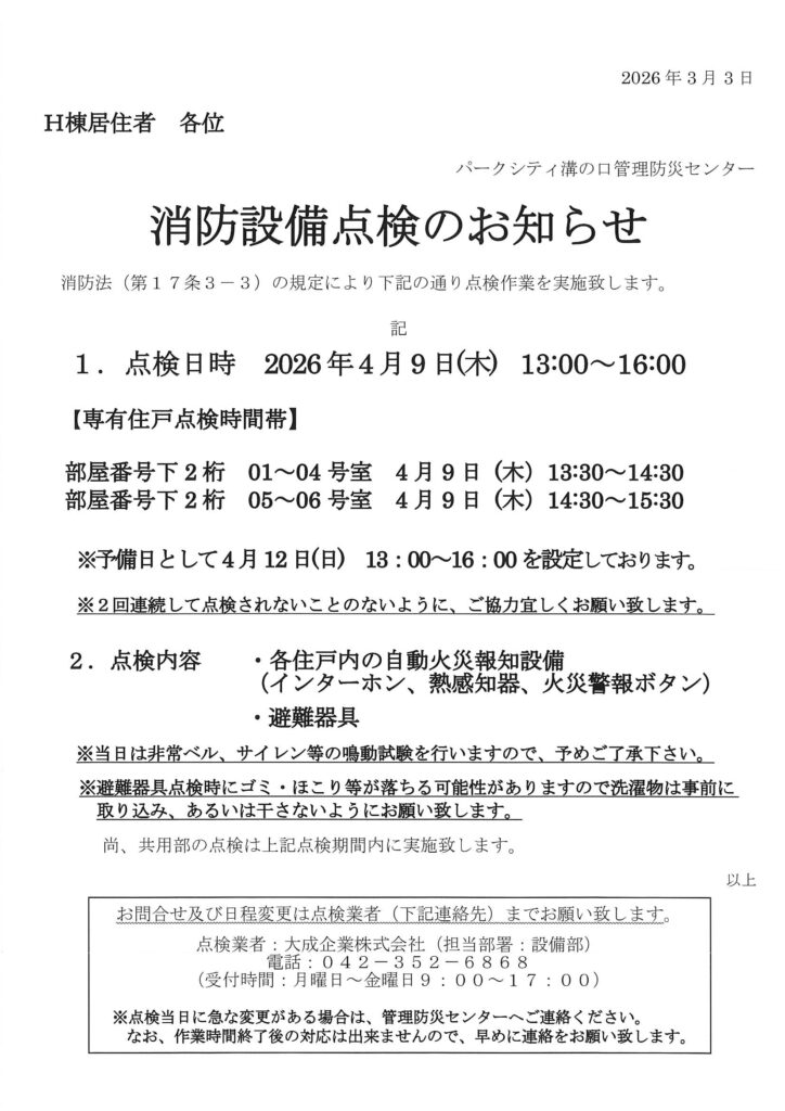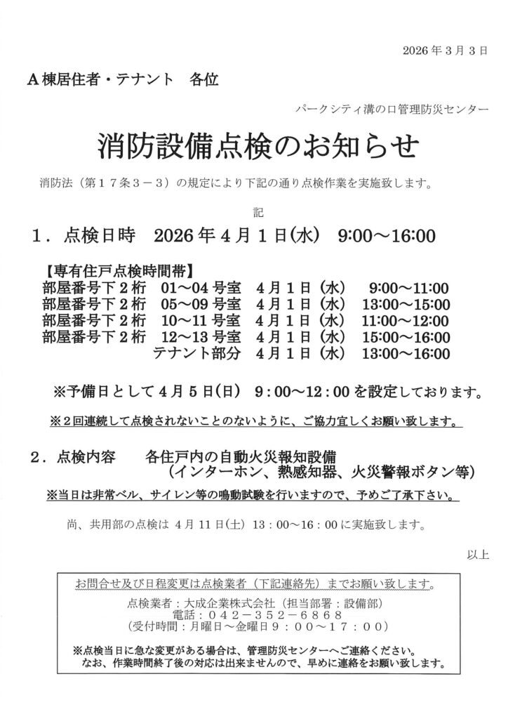 2026年3月4日 / 最終更新日時 : 2026年3月2日 管理防災センター 住民用:消防設備点検のお知らせ(4月) コメントを残すメールアドレスが公開されることはありません。 ※ が付いている欄は必須項目ですコメント ※ 名前 ※ メール ※ サイト